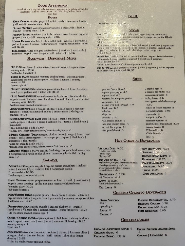 Breaded non GMO chicken breast, organic steamed poached eggs, valbrezo feta, tomato, chives, organic homemade hollandaise herbed goat cheese, English muffin, & organic homemade hollandaise. Contains raw eggs. Additional hollandaise for an additional charge.