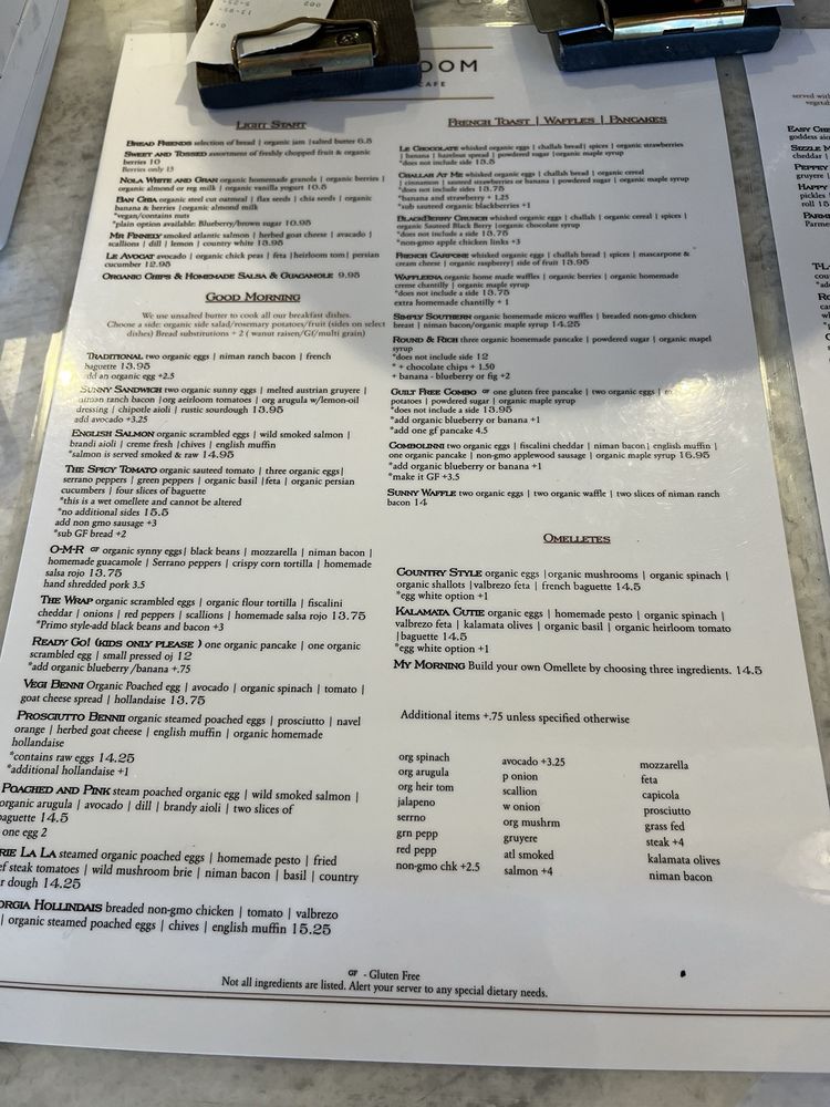 Organic eggs organic mushrooms, organic spinach, organic shallots, valbrezo feta, & French baguette. Egg white option with additional charge.